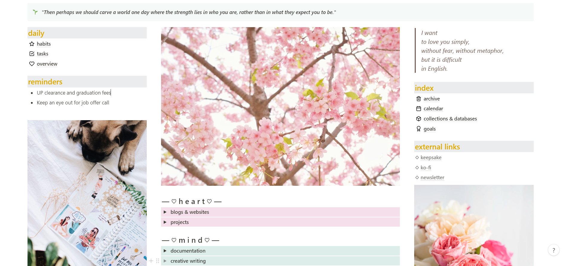In contrast, Notion feels like an intuitive extension of my brain. It’s like a blank canvas with just the right amount of functionalities. Thus, I no longer need to switch apps or tabs or whatever. Instead, my whole life is laid out and confined in a single space that’s tailor-fit to my needs.